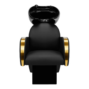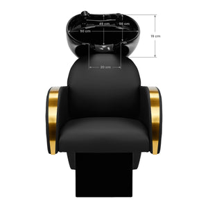 A megfelelően profilozott, tartós habbal töltött szék magas használati kényelmet biztosít, az elegáns karfák pedig lehetővé teszik az ügyfél vállainak megfelelő elhelyezését. A háttámla optimális szögben van elhelyezve, hogy lehetővé tegye a megfelelő testhelyzet felvételét és kiváló gerinctámasztást biztosítson. A fekete árnyalatú borítás és az arany színű lakkozott fém díszítőelemek időtlen eleganciát kölcsönöznek neki, emellett hosszú távú tartósságot és könnyű tisztítást garantálnak. A jellegzetes hajmosó klasszikus kivitelezése miatt szinte bármilyen térben remekül mutat. A készlet tartalmazza a teljes fekete árnyalatú szerelvényt, beleértve a csaptelepet, a zuhanyfejet és a dedikált tömlőket, hogy teljes eszközkészletet biztosítson a munkához.