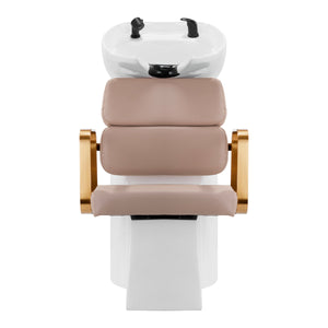 A profilozott szék megfelelő deréktámaszt és ezáltal magas használati kényelmet biztosít. A geometrikus formájú, arany árnyalatú fém karfák lehetővé teszik az ügyfél vállainak helyes elhelyezését. A tartós, deformációálló habbal való töltés és a bézs árnyalatú, kellemes tapintású szintetikus bőrből készült kárpitozás biztosítja a bútor tartósságát, a könnyű tisztítást és a kényelmes használatot hosszú ideig. A hajmosó egység eredeti, elegáns megjelenése egyedi kifejezést kölcsönöz a belső térnek. A készlet tartalmaz teljes szerelvényeket fekete árnyalatokban, beleértve egy csapot, egy zuhanyfejet és dedikált tömlőket, hogy teljes eszközkészletet biztosítson a munkához.