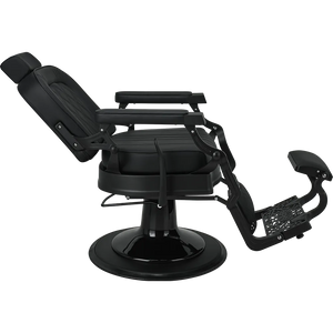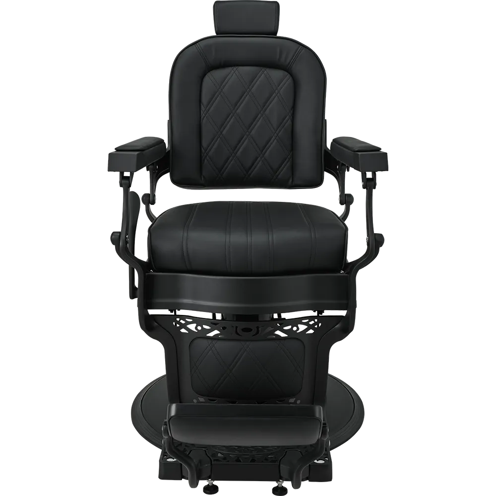 LOUIS barber chair Retro style with a modern twist. A solid metal frame with decorative detailing, black upholstery with quilted backrest and seat. The ergonomic backrest, adjustable headrest, and swiveled footrest provide maximum comfort for both work and client relaxation. An excellent choice for salons with character. Black upholstery