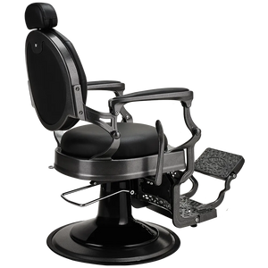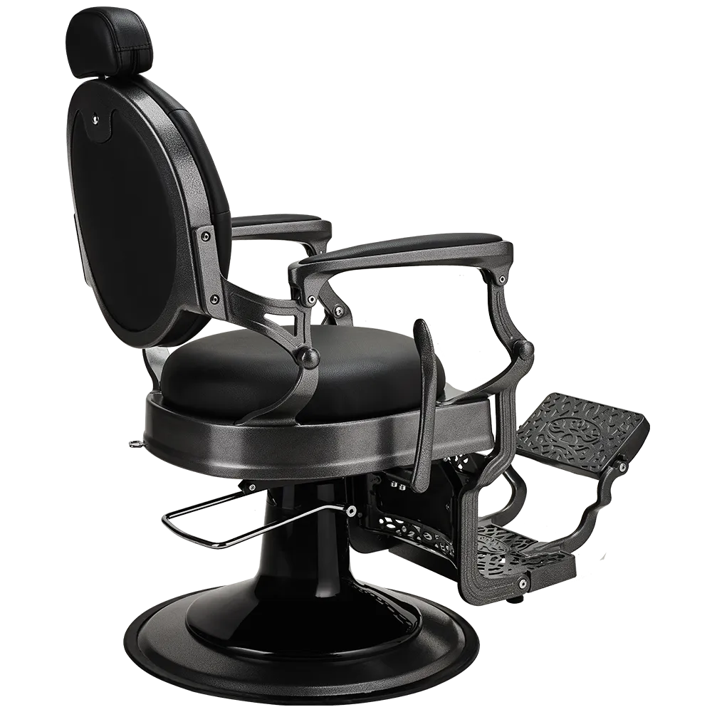 The perfect chair for vintage barbershops. The backrest is padded with buttons, while the elegant black upholstery pairs beautifully with the matte dark metal decorative frame. Black upholstery