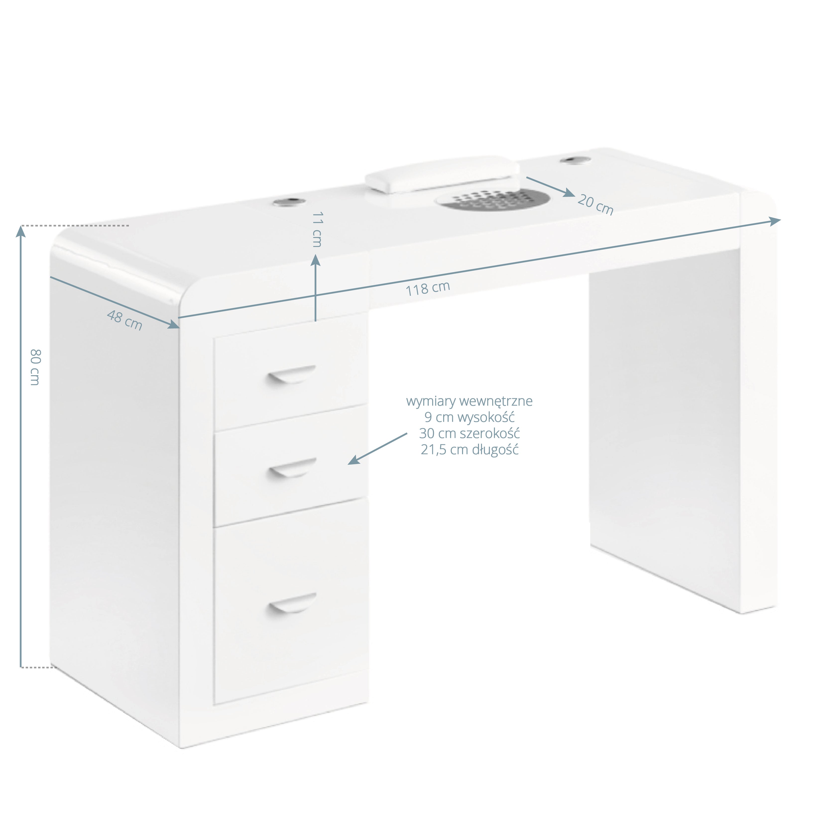 Három tágas fiók megkönnyíti a legszükségesebb kozmetikumok és eszközök rendszerezését és rendben tartását. Az asztal praktikus elszívóval van felszerelve, amely hatékonyan csökkenti a káros por mennyiségét, tiszta és friss levegőt biztosítva a munkahelyen. Ugyanakkor, mivel az asztallapba van integrálva, nem foglal el értékes munkaterületet. A speciálisan kialakított kábelvezetők megkönnyítik a szükséges eszközök rendszerezését a szalonban, mint például a körömcsiszolók, kezelőlámpák vagy körömlámpák, lehetővé téve a kábelek elrejtését.