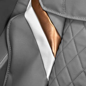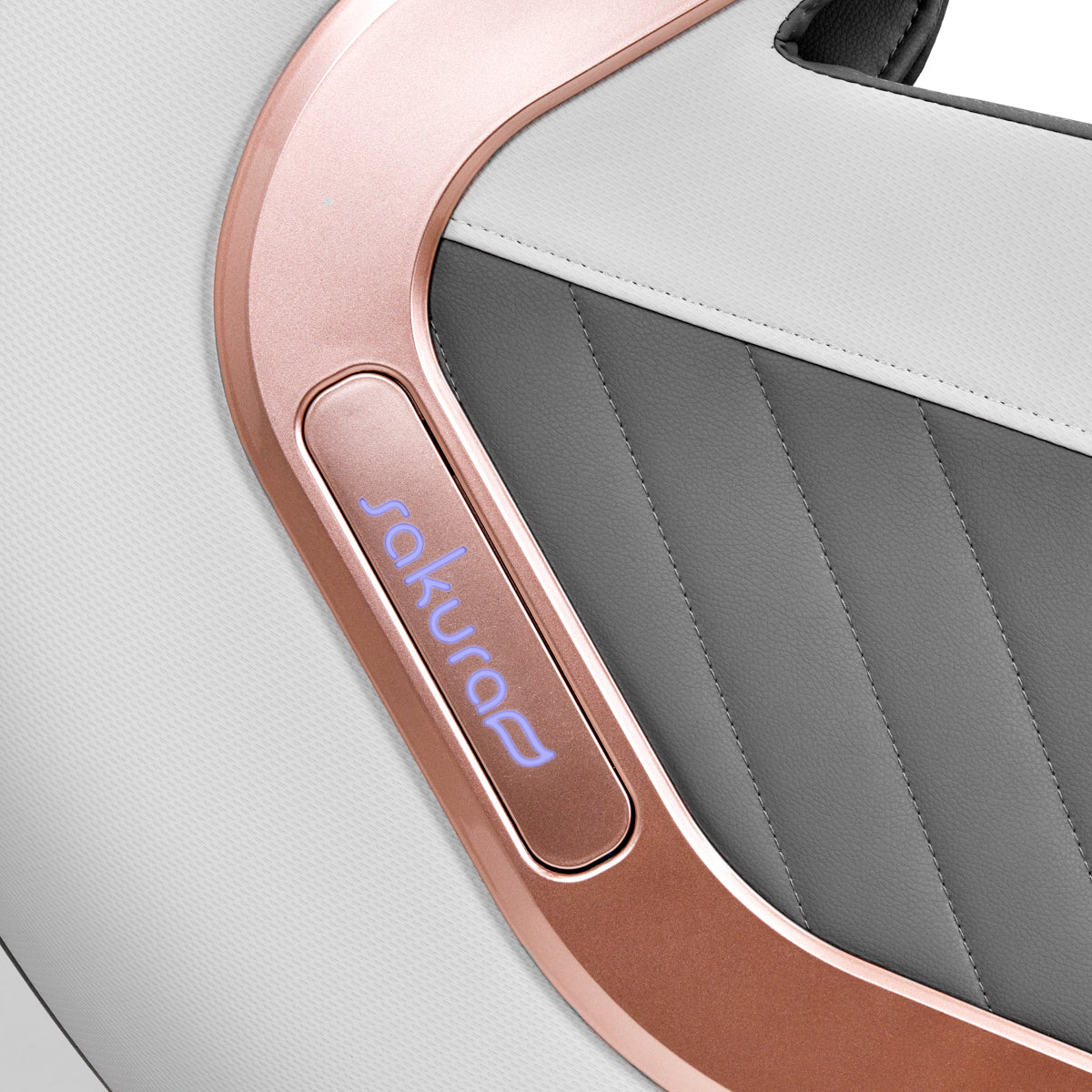 A fotel kényelmes belső tere kellemes tapintású műbőrrel van bevonva szürke árnyalatokban. Az ilyen anyag használata magas nedvességállóságot és könnyű tisztíthatóságot biztosít. A fotel külső részein használt fehér és szürke anyagok, valamint a rózsaarany díszítőelem jellegzetes, elegáns megjelenést kölcsönöz a terméknek, amely megkülönbözteti a többitől. A gondosan elkészített szegélyek stílusos megjelenést kölcsönöznek neki, és a szilárd konstrukció hosszú használatot garantál. Egy kompakt modell esztétikus kivitelezéssel és klasszikus színvilággal tökéletesen illeszkedik bármely belső térbe. A Sakura Classic 802A masszázsfotel a tökéletes módja a pihenésnek bármikor, különösen egy fárasztó nap vagy egy nehéz edzés után.