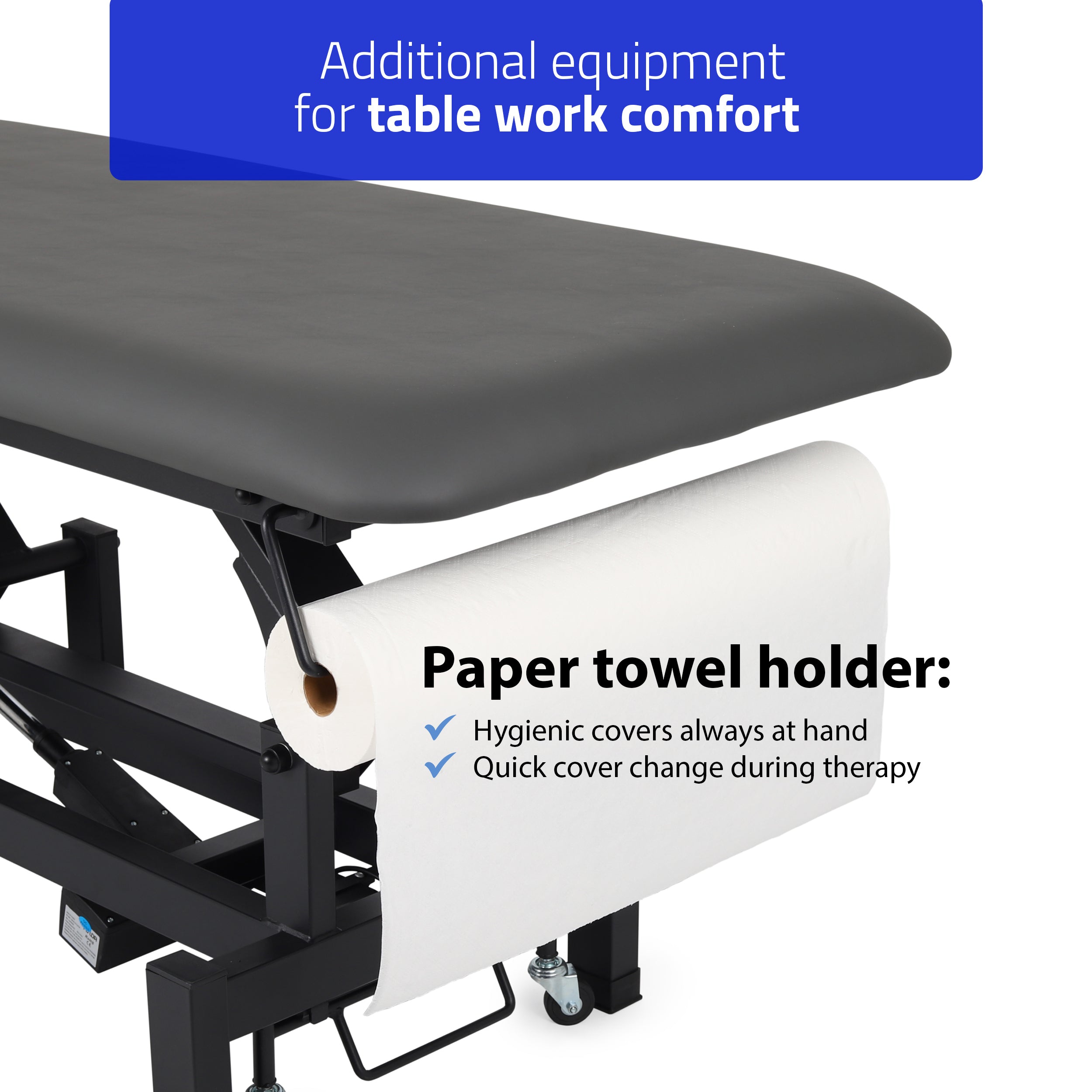 Tartós konstrukció: A megnövelt vázszilárdság azt jelenti, hogy az asztal megengedett terhelése 200 kg, ami lehetővé teszi a biztonságos használatot még nagyobb terhelés esetén is. Stabil konstrukciójának köszönhetően az asztal ellenáll a rezgéseknek és mozgásoknak a kezelések során.