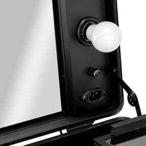 Egy funkcionális kozmetikai doboz kényelmes, hordozható, kerekes bőrönd formájában. Tökéletes megoldás mobil kozmetikusok vagy sminkesek számára. Nagyon tágas. Négy teleszkópos lábbal rendelkezik, melyeknek köszönhetően megfelelően beállíthatjuk az állomás magasságát. Világítás a tükör oldalain. A bőrönd belsejében további négy összecsukható polc található apró kiegészítők számára. Fekete színű.