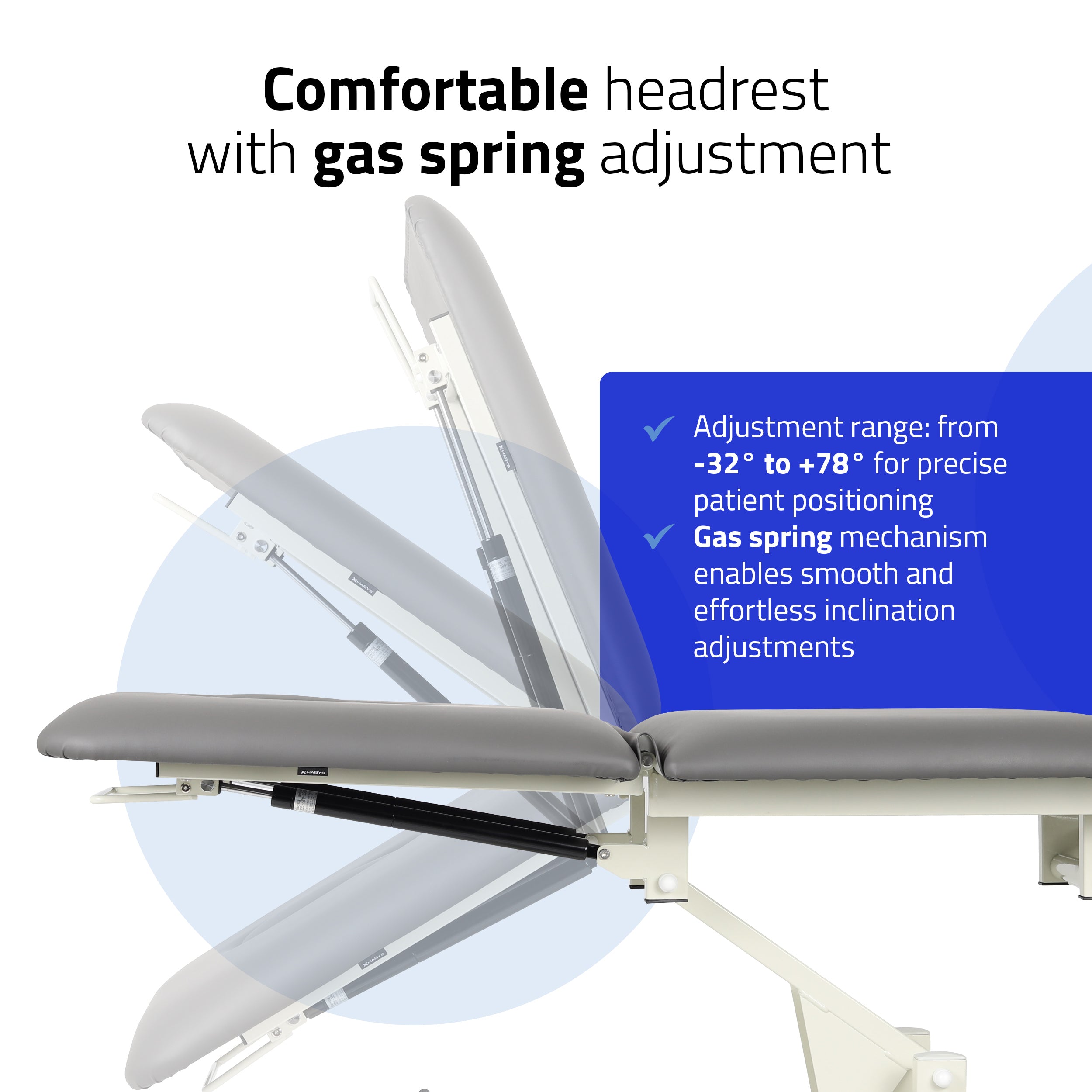 Állítható fejtámasz: a dőlésszög gázrugóval történő beállításának lehetősége -32°-tól +78°-ig lehetővé teszi a páciens pozíciójának pontos beállítását az adott terápia követelményeihez.